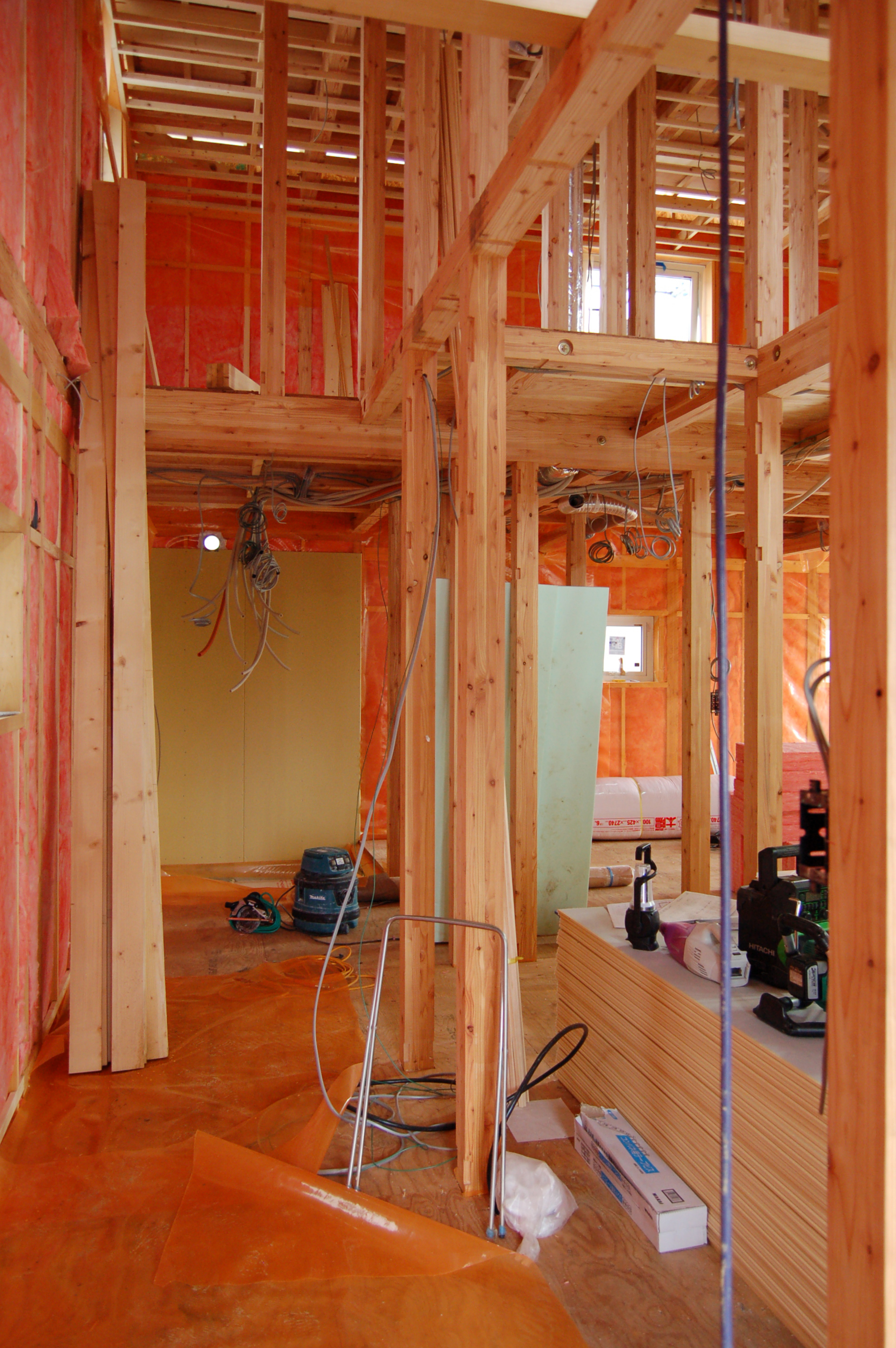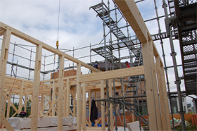 札幌市内で工事中の「court house」建方が始まりました。承認図等の確認で少し時間が掛かり、予定工期より若干遅れ気味。今週中に屋根まで組み上げ、来週から防水工事。